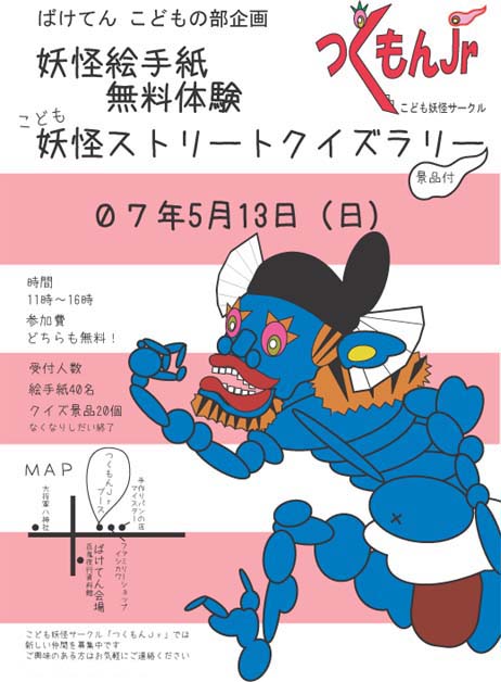 先日は京都で気温が30℃をこえたとか・・・ ぬぅぅ、とける~ みんなは大丈夫かしら さてさて、ばけてんの日が近づいてきました 子ども妖怪サークル「つくもんJr」でも子どもたちの作品をおひろめさせてもらいますよ~ でもねでもね 『体験する』ことを大切にしたい!! をモットーに活動している私たちつくじゅに ただ、子どもたちの作品を並べるだけでいいのか!? と、七転八倒した末・・・・・・ 妖怪絵手紙無料体験 & みんな集まれ! こども妖怪ストリートクイズラリー をやっちゃいます!! 開催日はばけてんの初日、5月13日 時間は11時から16時まで (材料がなくなったら終了ですが) 場所は子どもサークルブースです (商店街を歩いていただけばすぐにわかりますよ) 放浪の旅で芭蕉が俳句を残したように、山下清画伯が絵を描いたように・・・ あなたも絵手紙に思い出を残しませんか? そしてみんな!! 妖怪ストリートに並んでいる妖怪オブジェたちのこと、どれぐらい知ってるかな? クイズラリーでは、妖怪ストリートにちなんだ問題がいっぱい 答えを求めて、ストリートを走り回ってくれぃ! 全問正解できると、すてきな妖怪グッズをプレゼント!! 君の挑戦をまっているよ~ あぁ~、日曜日はお天気になりますように~ (妖怪も神頼みでございます) |